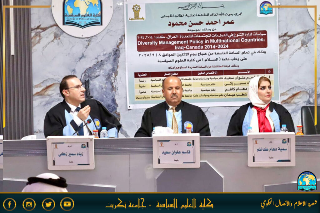 تدريسي كلية العلوم السياسية جامعة الموصل عضواً لِلَجنة مناقشة رسالة ماجستير بجامعة تكريت عن إدارة التنوع في العراق وكندا