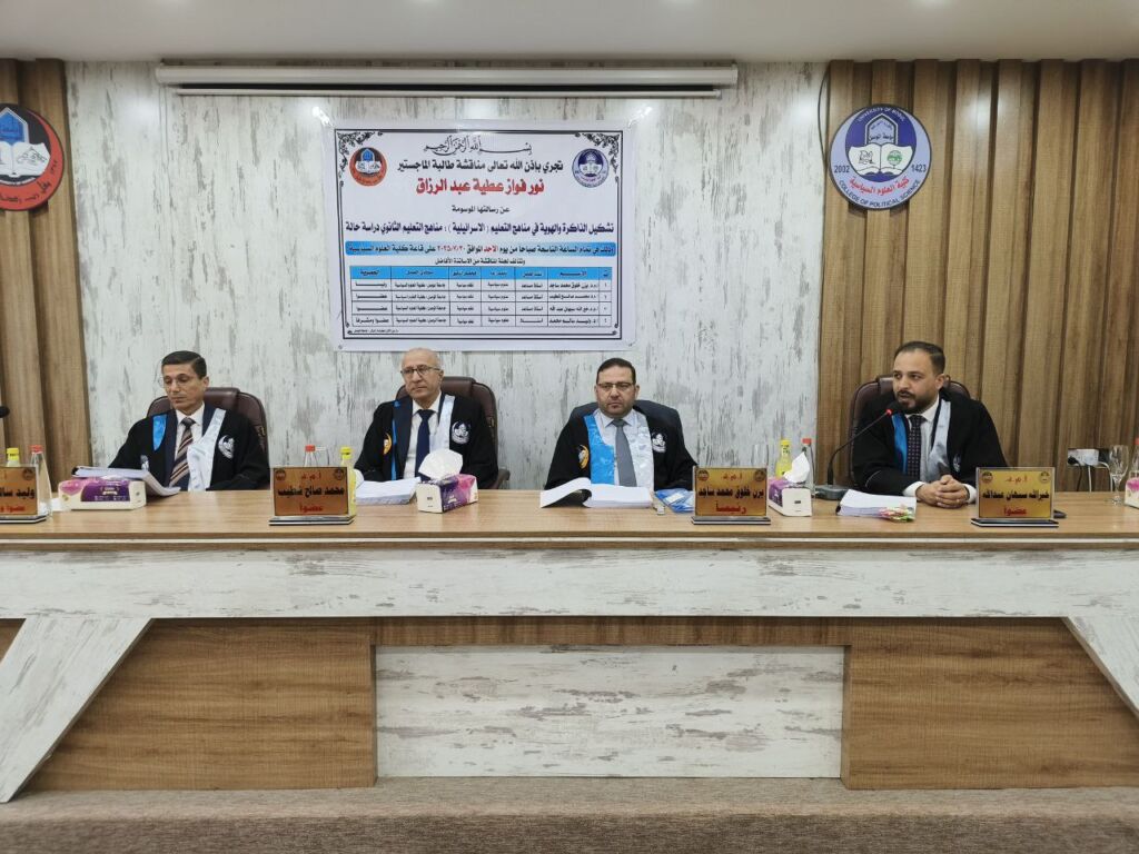 بحضور رئيس جامعة الموصل الأستاذ الدكتور وحيد محمود الابراهيمي وعميد كلية العلوم السياسية الأستاذ المساعد الدكتور صهيب خالد جاسم الطائي، نوقشت رسالة الماجستير الموسومة: “تشكيل الذاكرة والهوية في مناهج التعليم (الإسرائيلية): مناهج التعليم الثانوي دراسة حالة”، التي تقدّمت بها الطالبة الفلسطينية نور فواز عطية ضمن مبادرة المنحة الدراسية “أدرس في العراق”، وذلك يوم الأحد 20 تموز 2025. استهلت المناقشة بقراءة سورة الفاتحة ترحماً على شهداء حادثة الكوت