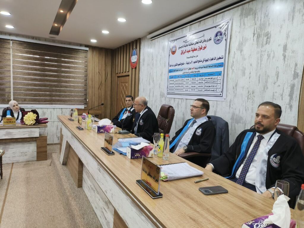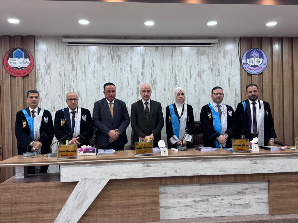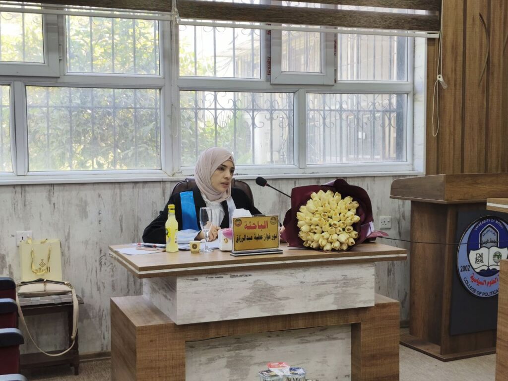 نوقشت الرسالة في كلية العلوم السياسية بحضور رئيس الجامعة الأستاذ الدكتور وحيد محمود الإبراهيمي وعميد الكلية الأستاذ المساعد الدكتور صهيب خالد جاسم الطائي.