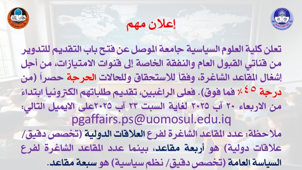 تنفيذاً لأهداف التنمية المستدامة، الهدف الثالث: الصحة الجيدة والرفاه، والهدف الرابع: التعليم الجيد، والهدف العاشر: الحد من أوجه عدم المساواة، والهدف السادس عشر: السلام والعدل والمؤسسات القوية؛ شرعت شعبة الشؤون الإدارية لكلية العلوم السياسية جامعة الموصل بتعليق لوحات إرشادية توجيهية في أروقة ومداخل الكلية، وذلك يوم الأربعاء 20 آب 2025.