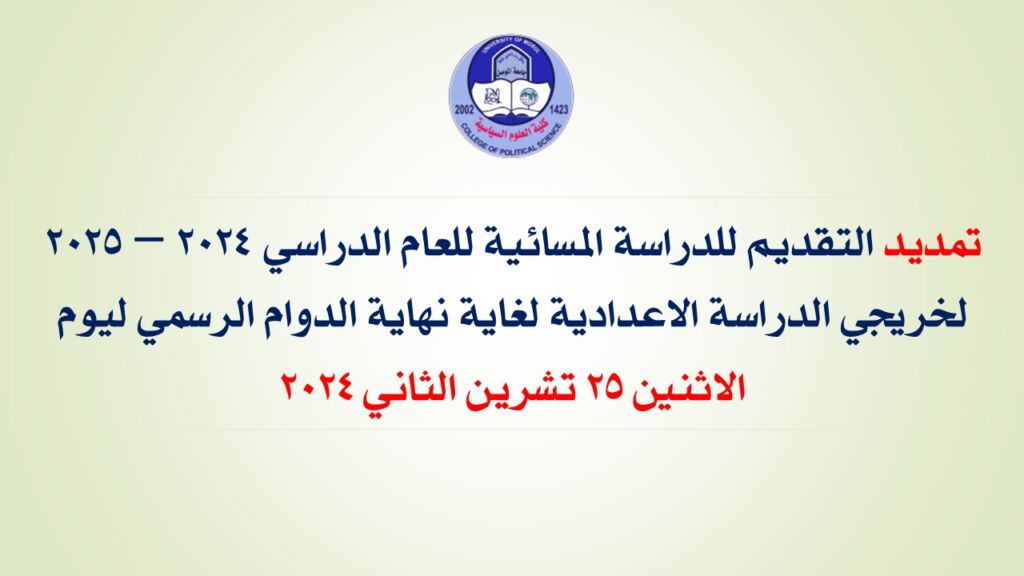تمديد التقديم للدراسة المسائية لكلية العلوم السياسية جامعة الموصل للعام الدراسي 2024 – 2025 لغاية الاثنين 25 تشرين الثاني 2024
