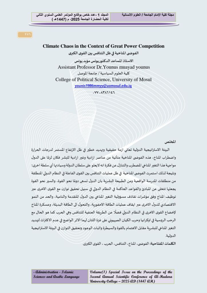 تحقيقاً لأهداف التنمية المستدامة، الهدف الثالث عشر: العمل المناخي، والهدف السادس عشر: السلام والعدالة والمؤسسات القوية، والهدف السابع عشر: الشراكات لتحقيق الأهداف؛ نشرت كلية الحضارة الجامعة أبحاث وقائع المؤتمر السنوي الثاني لكلية الحضارة الجامعة الموسوم: “التغيرات المناخية: التحديات والحلول”، الذي انعقد في المدة 1 – 2 تشرين الأول 2025. وتمّ النشر بواقع مجلدين اثنين، متضمناً عشرات الأبحاث المُشارِكة في المؤتمر المذكور. ومن جانب كلية العلوم السياسية جامعة الموصل، فقد تمّ نشر البحث المشترك للأستاذ الدكتور سالم مطر عبدالله، الموسوم: “التداخل بين التغيرات البيئية والبعد الأمني في سياق التنافس الدولي على الموارد”. كما تمّ نشر البحث المنفرد للأستاذ المساعد الدكتور يونس مؤيد يونس، الموسوم: ” الفوضى المناخية في ظل التنافس بين القوى الكبرى”. وفي السياق ذاته، نُشر للمدرس المساعد داليا عادل شيت والمدرس المساعد فنر عماد خليل بحثهما المشترك، الموسوم: “الجهود الدولية وتأثيرها في مواجهة التحديات البيئية: مؤتمرات المناخ الدولية انموذجاً”.