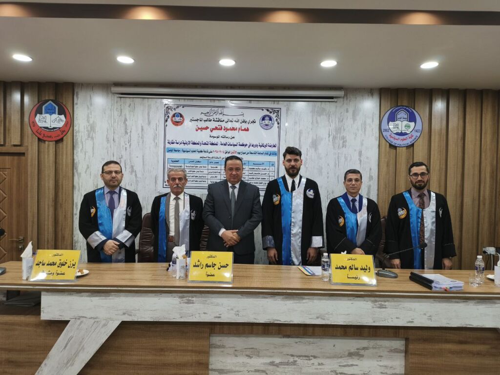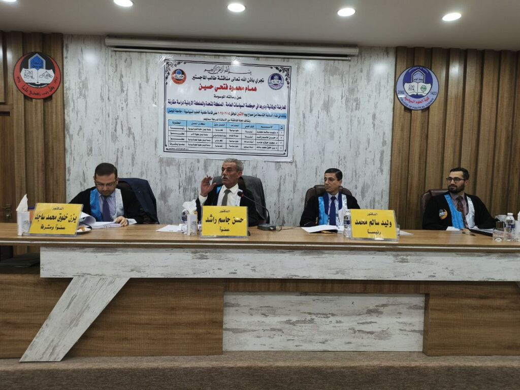 تألفت لجنة المناقشة من الأستاذ الدكتور وليد سالم محمد (رئيساً)، والأستاذ الدكتور حسن جاسم راشد (عضواً)، والأستاذ المساعد الدكتور محمد حازم حامد (عضواً)، والأستاذ المساعد الدكتور يزن خلوق محمد ساجد (عضواً ومشرفاً).