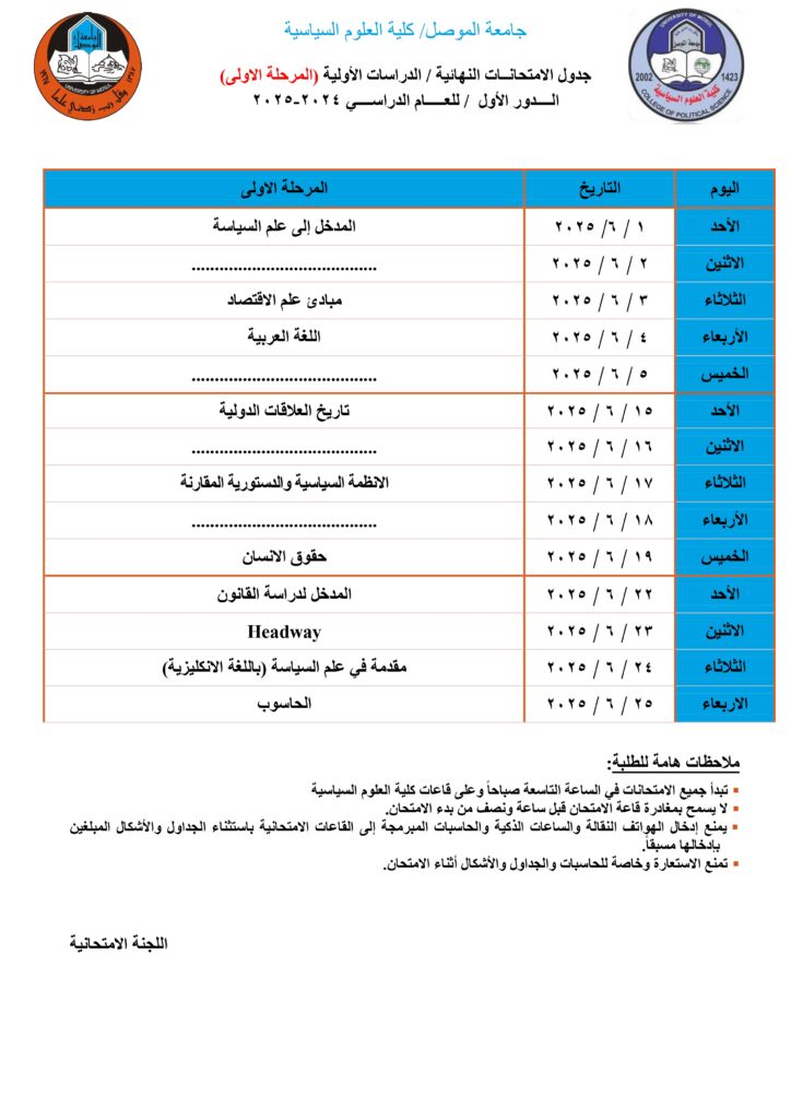 مجلس كلية العلوم السياسية جامعة الموصل يناقش في اجتماعه الرابع عشر المفتوح للعام الدراسي 2024 – 2025 جدول الامتحانات النهائية للمرحلة الأولى