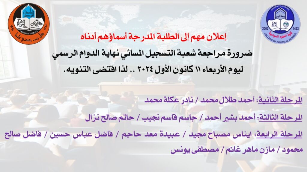 عمادة كلية العلوم السياسية جامعة الموصل تعزي مساعد باحث سياسي وسن محمد أيوب لوفاة والدها رحمهُ الله