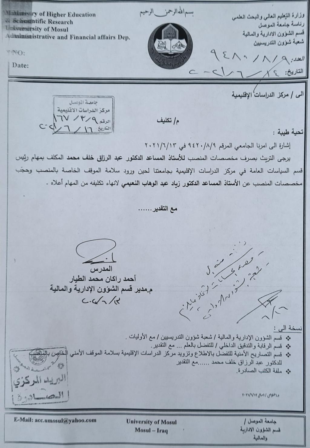 - *تكليف الأستاذ المساعد الدكتور “عبدالرزاق خلف محمد” بمهام رئيس قسم السياسات العامة في مركز الدراسات الإقليمية بناءً على الأمر الجامعي المرقم 9420 والمؤرخ في 13 حزيران 2021 …متمنين للجميع التوفيق والسداد.