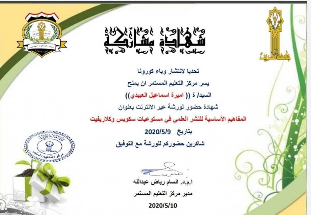 شاركت الدكتورة “أميرة إسماعيل العبيدي” التدريسية والباحثة في قسم الدراسات الإقتصادية والإجتماعية في مركز الدراسات الإقليمية – جامعة الموصل في الملتقى العلمي الدولي الذي أقامته الاكاديمية الدولية للقيادة والتنميةIALD) ) بالتعاون مع جامعة تكريت – كلية التربية للعلوم الانسانية بعنوان (التعليم الإلكتروني في زمن كورونا – التحديات والفرص) ، بتاريخ 12 أيار 2020 ، تم التركيز من خلاله على التدريب الالكتروني للتدريسي والطالب ومعوقاته في ظل تردي خدمة الانترنت. كما شاركت ” العبيدي ” في ورشة علمية لجامعة تكريت بالتعاون مع مركز التعليم المستمر بعنوان ( المفاهيم الاساسية للنشر العلمي في مستوعبات سكوبس وكلاريفيت) في 9 أيار 2020 . هدفت الورشة الى التعرف على بعض المصطلحات في مجال النشر العلمي لتسهيل التعامل مع المجلات العلمية وقواعد البيانات في كل من سكوبس وكلاريفيت . فضلا عن المشاركة في محاضرة الكترونية بعنوان (التعليم الالكتروني في جامعة نينوى التحديات والعلاج) نظمتها جامعة نينوى في 8 أيار 2020 ، تمحورت حول حقيقة أن جائحة كورونا كانت مباغتة وسريعة وكان من المفترض وضع حلول سريعة لتدارك الوقت ، من استغلال العثرات وتحويلها الى سبل لتجاوز الأزمات وبطريقة العمل الجماعي . أخيرا ، المشاركة في الندوة التي اقامتها كلية الحقوق في جامعة الموصل تحت عنوان (إجراءات السلطة التنفيذية لمواجهة جائحة كورونا .. المنجزات ، المعوقات ، الحلول) ، بتاريخ 25 نيسان 2020 ، وتناولت الندوة الجوانب الصحية والتعليمية ومسألة الضمان الاجتماعي فضلا عن الاجراءات الامنية المتخذة في ظل جائحة كورونا اضافة الى تأثير العلاقة بين السلطة الاتحادية والمحلية على سير الاجراءات المتخذة .