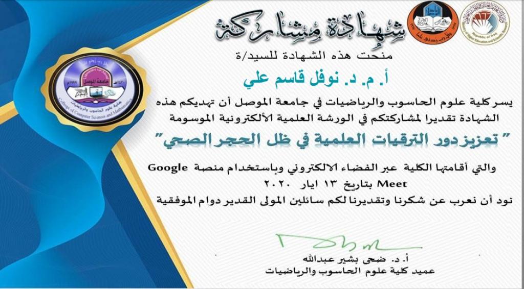 شارك الأستاذ المساعد الدكتور نوفل قاسم علي الشهوان، رئيس قسم الدراسات الاقتصادية والاجتماعية في مركز الدراسات الاقليمية في الدورة التدريبية الالكترونية الموسومة: (Zoom Meeting and Webinar : Practice with Tips) التي نظمتها كلية علوم الحاسوب والرياضيات – قسم البرمجيات يوم الخميس الموافق 14 أيار 2020 . تم من خلال الدورة توضيح كيفية توظيف برنامج “Zoom” من أجل عقد الاجتماعات واللقاءات الفيديوية ، والتمييز بين استخدام البرنامج لإدارة لقاء او ندوة، وكيفية التطبيق العملي، واهم النصائح لمستخدمي البرنامج.كما شارك ” الشهوان” في الورشة العلمية الالكترونية التي أقامتها لجنة الترقيات العلمية في كلية علوم الحاسوب والرياضيات بجامعة الموصل تحت عنوان : “تعزيز دور الترقيات العلمية في ظل الحجر الصحي” ، بتاريخ 13 أيار 2020 ، فقد تم خلال الورشة توضيح القانون الجديد للترقيات العلمية في العراق، والية تقديم معاملة الترقية الكترونيا وشرح عملية تقديم معاملة الترقية وكذلك الآليات المعتمدة للترقية العلمية وملئ الجداول المحددة ضمن التعليمات الواردة وتوضيح مفهوم الانشطة العلمية المطلوبة من عضو هيئة التدريس لأغراض الترقية العلمية.