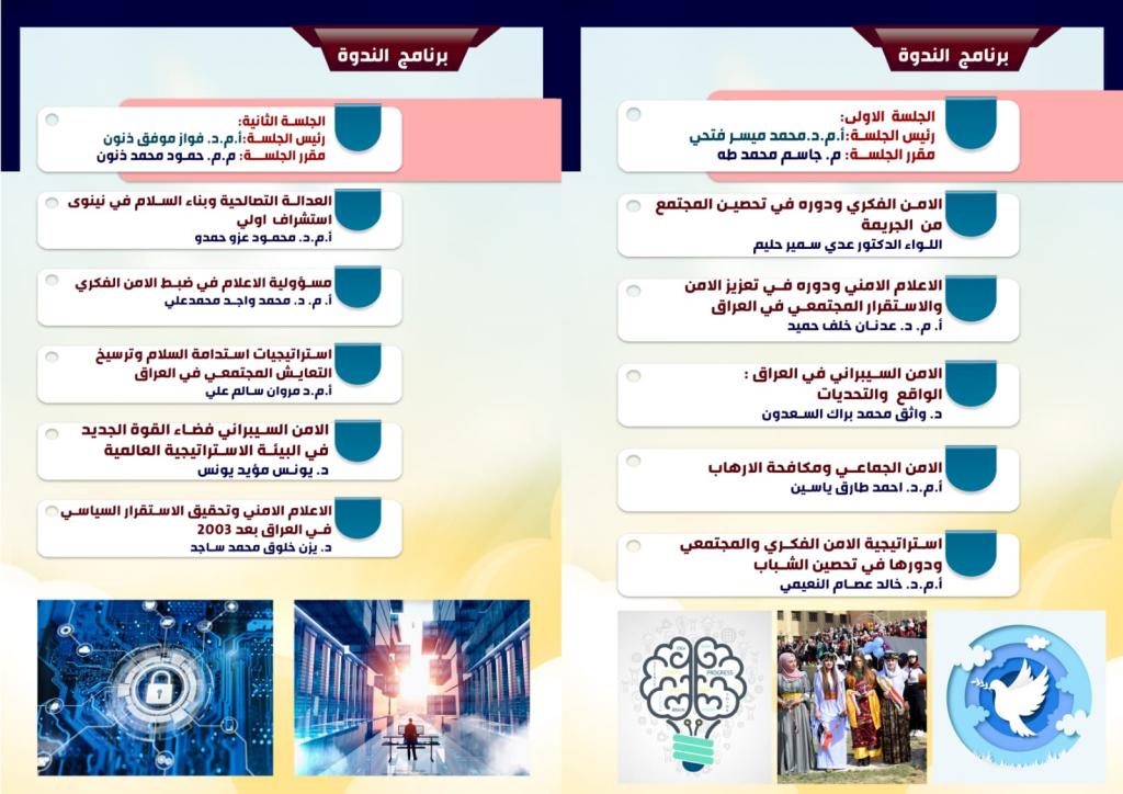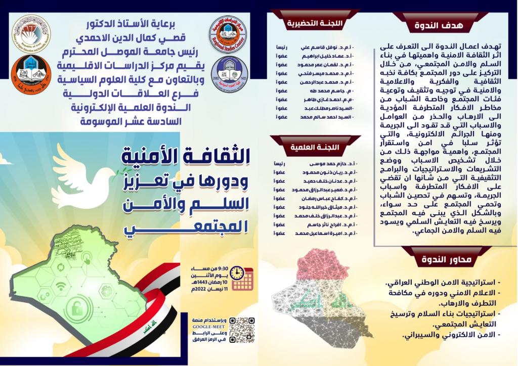 برعاية الأستاذ الدكتور قصي كمال الدين الأحمدي رئيس جامعة الموصل أقام مركز الدراسات الإقليمية وبالتعاون مع كلية العلوم السياسية فرع العلاقات الدولية ، الندوة العلمية الإفتراضية السادسة عشر الموسومة ” الثقافة الأمنية ودورها في تعزيز السلم والأمن المجتمعي ” ، في 11 نيسان 2022 .هدفت الندوة الى تقديم الأفكار والمقترحات والتوصيات التي من شأنها أن تسهم وبشكل فاعل في رفع مستوى الثقافة الأمنية لدى فئات المجتمع كافة وخاصة الشباب والتعرف على أثر الثقافة الأمنية وأهميتها في بناء السلم والأمن المجتمعي من خلال التركيز على دور النخب الأكاديمية والثقافية والفكرية والإعلامية والأمنية في توجيه وتثقيف وتوعية المجتمع من مخاطر الأفكار المتطرفة المؤدية الى الإرهاب والحذر من العوامل والأسباب التي قد تقود الى الجريمة ومنها الجرائم الإلكترونية، والتي تؤثر سلباً في أمن واستقرار المجتمع، وأهمية مواجهة ذلك من خلال تشخيص الأسباب ووضع التشريعات والإستراتيجيات والبرامج التثقيفية بما يعزز مبادئ التسامح والتعايش السلمي ويرسخ الأمن المجتمعي.تناولت الندوة المحاور الآتية : استراتيجية الأمن الوطني العراقي والإعلام الأمني ودوره في مكافحة التطرف والإرهاب واستراتيجيات بناء السلام وترسيخ التعايش المجتمعي والأمن الإلكتروني والسيبراني.تضمنت الندوة استعراض أوراق العمل التالية: الأمن الفكري ودوره في تحصين المجتمع من الجريمة؛ الإعلام الأمني ودوره في تعزيز الأمن والإستقرار المجتمعي في العراق؛ الأمن السيبراني في العراق: الواقع والتحديات؛ الأمن الجماعي ومكافحة الإرهاب؛ استراتيجية الأمن الفكري والمجتمعي ودورها في تحصين الشباب؛ العدالة التصالحية وبناء السلام في نينوى: استشراف أولي؛ مسؤولية الإعلام في ضبط الأمن الفكري؛ استراتيجيات استدامة السلام وترسيخ التعايش المجتمعي في العراق؛ الأمن السيبراني فضاء القوة الجديد في البيئة الإستراتيجية العالمية؛ الإعلام الامني وتحقيق الإستقرار السياسي في العراق بعد عام ٢٠٠٣؛ الآليات الدولية لبناء السلام؛ دور الإعلام الأمني في مواجهة استراتيجية داعش الإعلامية؛ تأثير التهديدات السيبرانية على الأمن القومي العراقي؛ استراتيجيات بناء السلام في مجتمعات ما بعد النزاع؛ تحديات بناء السلام في دول ما بعد النزاع .