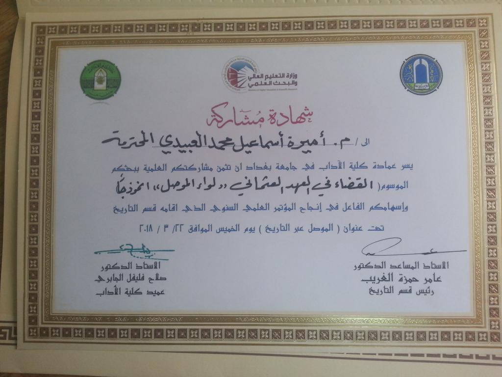 في ضوء التواصل العلمي مع الجامعات في المشاركة بالتدوات والمؤاتمرات العلمية ، وايمانا باهمية هذا التواصل الفكري الثر ، فقد شاركت الدكتوره اميرة اسماعيل محمد العبيدي التدريسية في قسم الدراسات التاريخية والثقافية بمركزنا في المؤتمر العلمي السنوي الاول لكلية الاداب في جامعة بغداد تحت عنوان ( الموصل عبر التاريخ) والذي اقيم في الفترة في 26 اذار من الشهر الجاري 2018 ، ببحثها الموسوم ( القضاء في العهد العثماني ، لواء الموصل انموذجا). ادارة الموقع تبارك للدكتورة اميرة اسماعيل هذا الانجاز العلمي