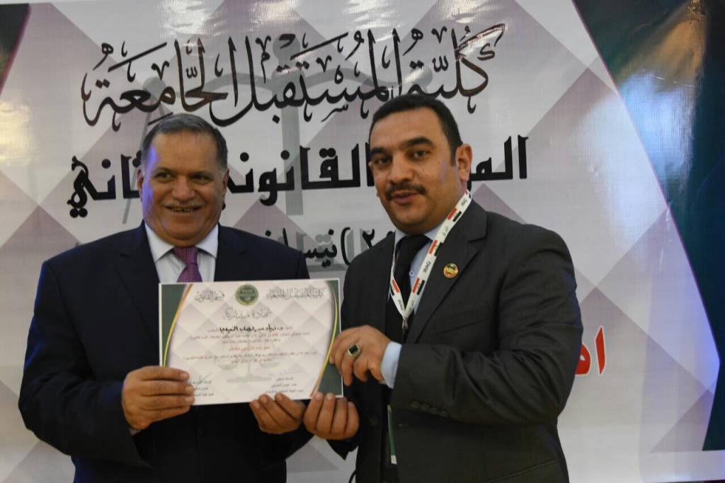 شارك الدكتور زياد عبدالوهاب النعيمي رئيس قسم السياسات العامة في المركز في المؤتمر القانوني الثاني الذي اقامته كلية المستقبل الجامعة في محافظة بابل والموسوم نو بناء تشريعي متكامل … ببحثه اشكاليات تطبيق المعاهدات الدولية في النظام القانوني للدولة، والذي انعقد في رحاب كلية المستقبل الجامعة على ارض بابل الحضارة، وبحضور رسمي واكاديمي من مختلف المحافظات العراقية ، وحظي الدكتور النعيمي بشهادة تقديرية تثمنيا لجهودة في المشاركة.ادارة الموقع تبارك للدكتور النعيمي نشاطاته العلمية متمنين له التوفيق الدائم