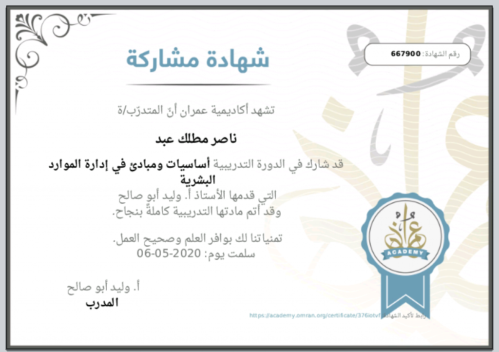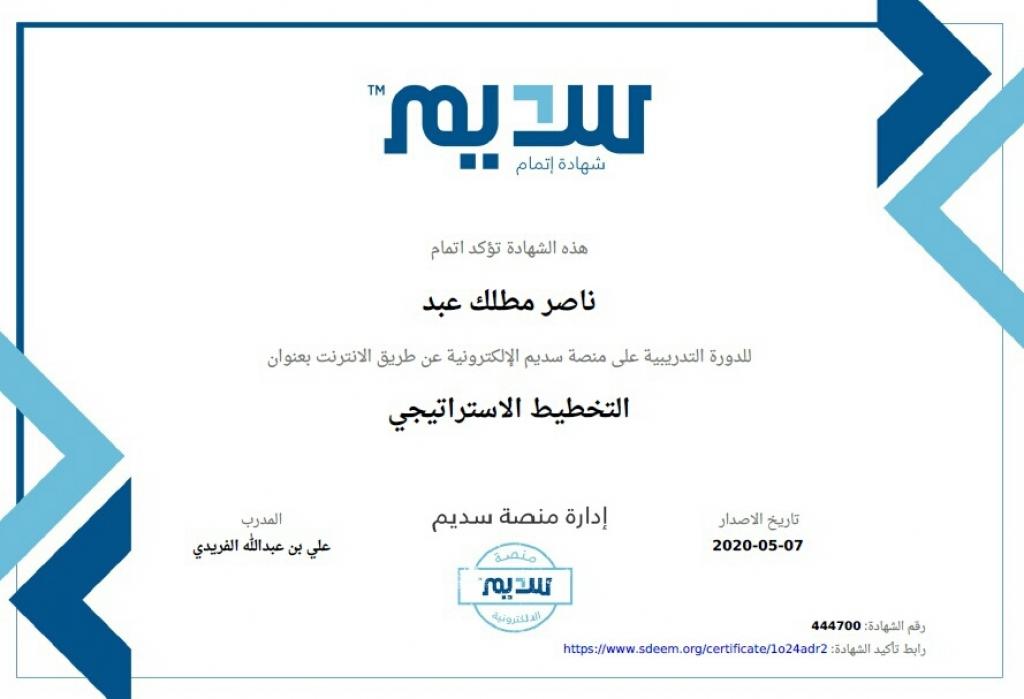 حصل السيد ” ناصر مطلك عبد ” ، المترجم ومسؤول الموقع الإلكتروني في مركز الدراسات الإقليمية – جامعة الموصل على ست شهادات تقديرية من خلال مشاركته في العديد من الدورات التدريبية الإلكترونية جاءت كالآتي : الأولى: شهادة سفير التعلم الإلكتروني من مركز البحث والتأهيل المعلوماتي في جامعة الكوفة بعنوان (التعلم الإلكتروني من اجل التغلب على الوقت والمكان والوباء) ، بتاريخ 7 أيار 2020 ; بينما كانت الشهادة الثانية من منصة “سديم” للتدريب الإلكتروني والموسومة ( التخطيط الإستراتيجي ) ، في 7 أيار 2020 . وثلاث شهادات من أكاديمية “عمران” للدورات الإلكترونية وهي : (العقل الإستراتيجي) ، (أساسيات ومبادئ في إدارة الموارد البشرية) ، (إدارة الموارد البشرية) ، بتاريخ 6 أيار 2020 . وأخيراً ، شهادة سفراء التوعية من خلال المشاركة في الورشة التدريبية التي اقامتها جامعة محمد بن راشد في دولة الامارات العربية المتحدة ، في 3 أيار 2020 .