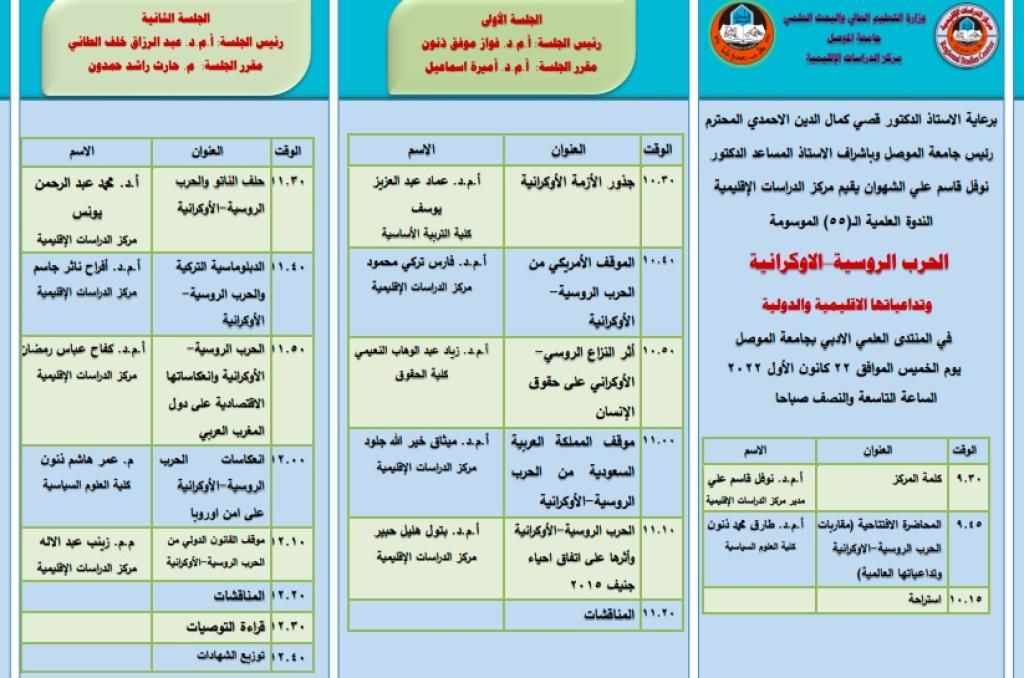 عقد مركز الدراسات الاقليمية ندوته العلمية ( 55) بتاريخ 22 كانون الأول 2022 بعنوان “الحرب الروسية – الاوكرانية وتداعياتها الاقليمية والدولية” بحضور السيد رئيس جامعة الموصل الاستاذ الدكتور قصي كمال الدين الاحمدي.هدفت الندوة الى تسليط الضوء على الحرب الروسية – الأوكرانية ومعرفة مجرياتها وتحليل مآلاتها المتوقعة على المستويين الإقليمي والدولي وبيان آثارها السياسية والإقتصادية ولاسيما في مجال الطاقة ، فضلا عن السعي لاستشراف مستقبل هذه الحرب وانعكاساتها وبخاصة على منطقة الشرق الاوسط.تضمنت الندوة جلستين سبقتهما محاضرة افتتاحية .عالج الباحثون المشاركون في الندوة من خلال اوراقهم البحثية ابعاد الحرب المذكورة على الشأن العالمي فضلا عن استعراض الجذور التاريخية للأزمة ، ومن ثم استعرضت الندوة المواقف الدولية والاقليمية تجاه الحرب ، واخيراً انعكاسات الحرب هذه على الامن الاوربي .تخلل الندوة عدد من المناقشات ذات الشأن ، وفي الختام ، تليت توصيات السادة المشاركين ، أعقب ذلك تكريم السادة المدراء السابقين بدرع المركز تثميناً واعتزازاً بجهودهم .