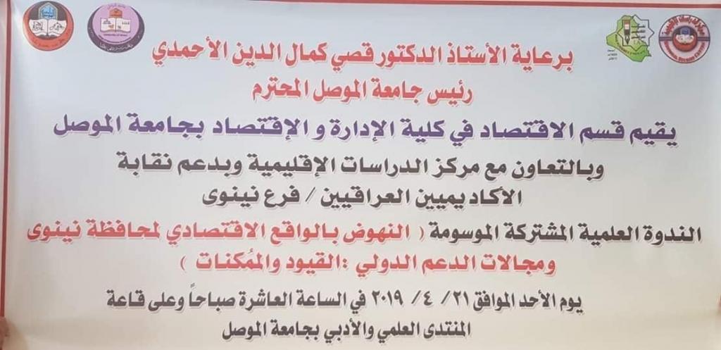 برعاية كريمة من الاستاذ الفاضل الدكتور قصي كمال الدين الاحمدي المحترم رئيس جامعة الموصل ، ستعقد كلية الادارة والاقتصاد- قسم الاقتصاد، وبالتعاون مع مركز الدراسات الاقليمية وبدعم نقابة الاكاديمين العراقيين – فرع نينوى، الندوة العلمية المشتركة الموسومة والموسومة ( النهوض بالواقع الاقتصادي لمحافظة نينوى ومجالات الدعم الدولي : القيود والممكنات) يوم للاحد القادم المصادف 21 نيسان الجاري 2019 ، وعلى قاعة المنتدى العلمي والادبي الساعة العاشرة صباحا …… والدعوة عامة للجميع