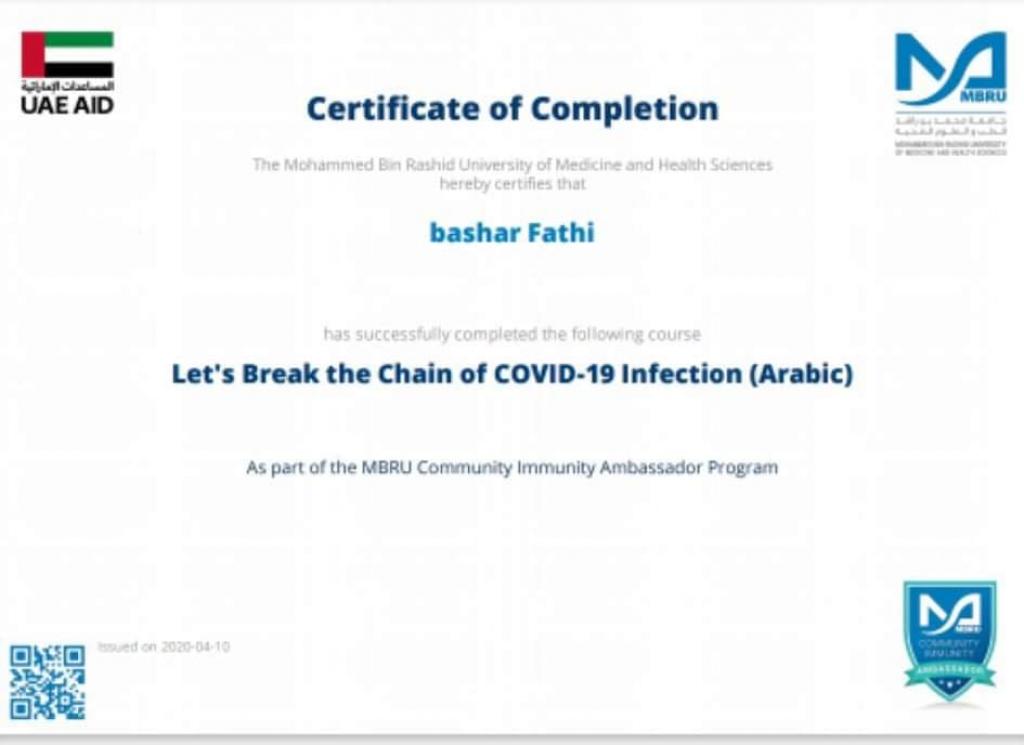 حصل كل من (د. بشار فتحي جاسم العكيدي ، د. جمانة محمد نايف الدليمي ، د. خالدة ابراهيم خليل الحبيطي ، د. أفراح ناثر جاسم العزاوي) التدريسيين والباحثين في مركز الدراسات الاقليمية – جامعة الموصل على شهادة سفراء التوعية من خلال مشاركتهم في الورشة التدريبية التي اقامتها جامعة محمد بن راشد في دولة الامارات العربية المتحدة والتي يتمحور برنامجها حول التدريب السريع على الجوانب الرئيسية للعدوى والمناعة من أجل رفع مستوى الوعي المجتمعي بخصوص كيفية الحيلولة دون انتشار وباء كوفيد-19 والسيطرة عليه .