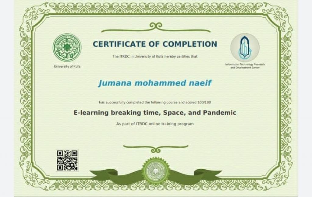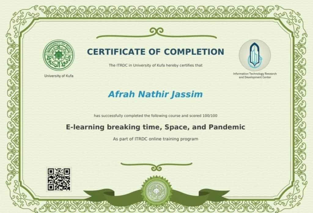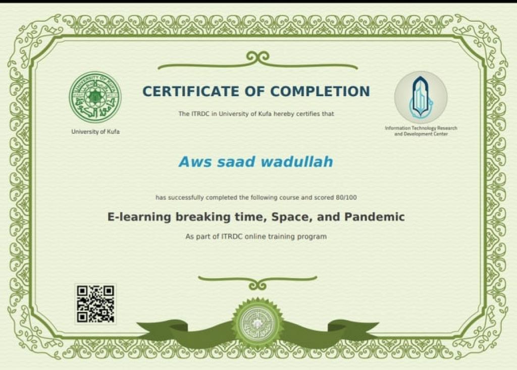 حصل كل من التدريسيين والباحثين ( الدكتور حامد محمد طه السويداني والدكتورة جمانة محمد نايف الدليمي والدكتورة افراح ناثر جاسم العزاوي) ، وكذلك ( الموظف: أوس سعد وعدالله) مركز الدراسات الإقليمية – جامعة الموصل على شهادة سفير التعلم الإلكتروني من مركز البحث والتأهيل المعلوماتي في جامعة الكوفة الكترونيا بعد اجتيازهم الإختبار الإلكتروني وهو عبارة عن دورة تدريبية الكترونية تحت عنوان (التعلم الإلكتروني من اجل التغلب على الوقت والمكان والوباء) الذي تضمن مجموعة من الأسئلة الإختبارية المتنوعة يجيب عليها الفرد و نسبة الاجابة فيها من ( ١٠٠ ) درجة.