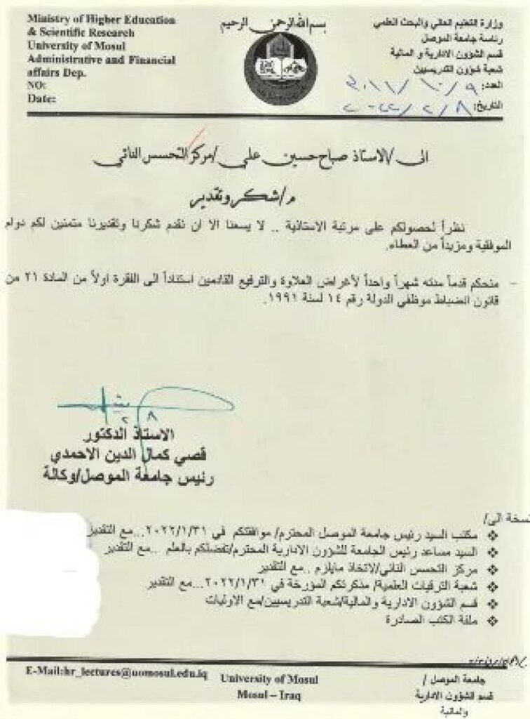 شكر وتقدير من السيد رئيس جامعة الموصل الى كادر من مركز التحسس النائي