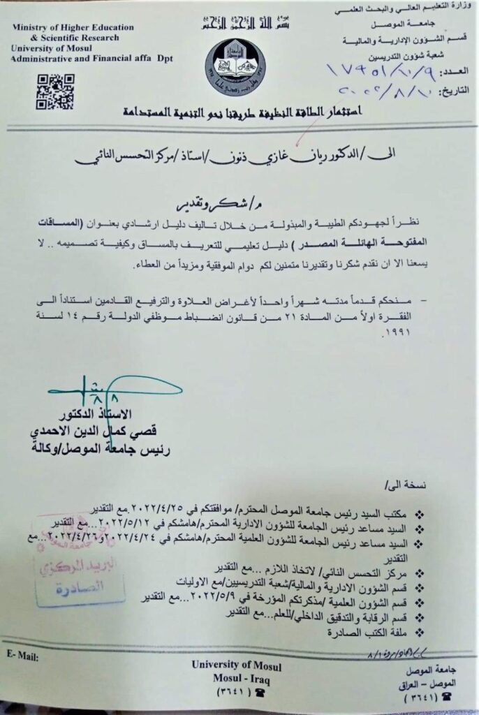 كرم السيد سيروان روزبياني النائب الاول لمحافظ نينوى عددا من كوادر مركز التحسس بكتاب شكر وتقدير وهم كل من الأستاذ صباح حسين علي/رئيس قسم المعالجة الرقمية والدكتورة عبير عادل محمد والدكتورة خنساء عبدالاله احمد لجهودهم المبذولة في إقامة الدورات العلمية والتدريبية لموظفي دوائر ومديريات المحافظة.من الجدير بالذكر ان مركز التحسس النائي، وتجسيدا للسياسة التي وضعها السيد رئيس الجامعة الأستاذ الدكتور قصي كمال الدين الاحمدي المحترم (الجامعة في خدمة المجتمع)، يقيم بشكل دوري دورات علمية متخصصة لموظفي دوائر المحافظة خدمة للمدينة. والتي كان اخرها اقامتهم دورة تدريبية بتاريخ 24 تموز 2022 لمدة 5 ايام لمرشحين من مختلف دوائر المحافظة لاستخدام التقنيات الحديثة في رسم الخرائط واستخدام برنامج نظم المعلومات الجغرافية ArcGIS 10. 6 ونظام الملاحة العالمي GPS ونظم الاسقاط الجغرافية