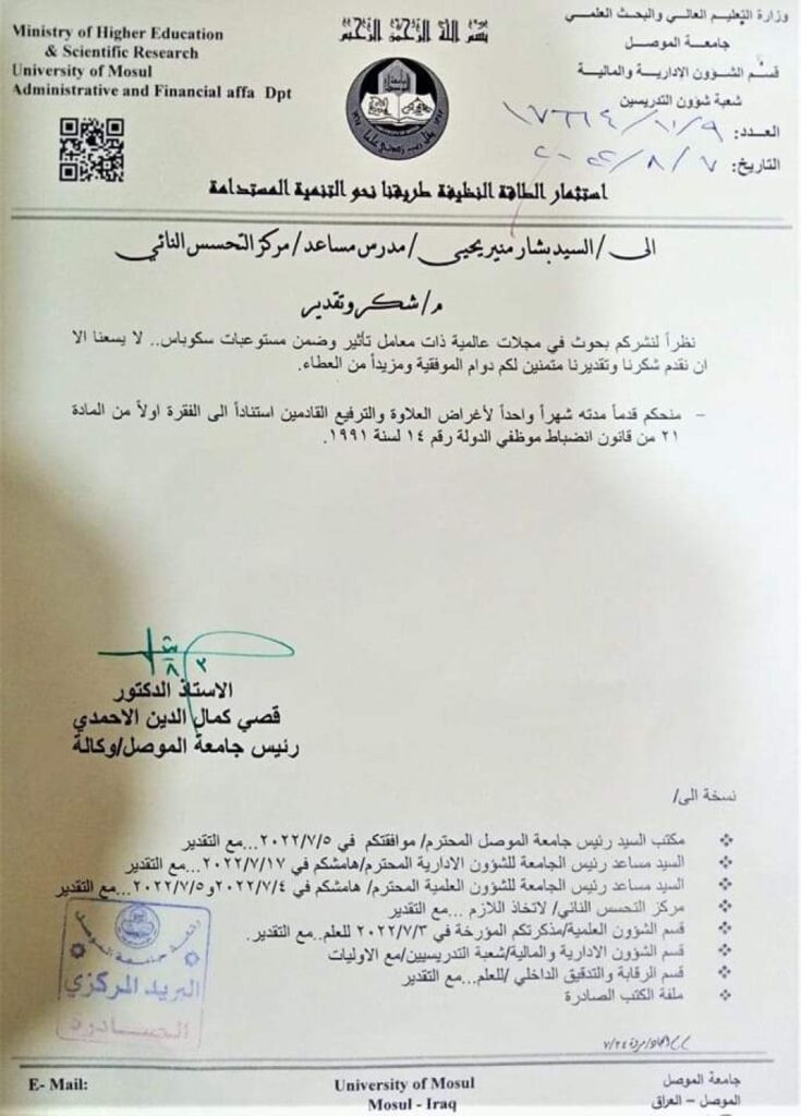 قدم السيد رئيس جامعة الموصل الأستاذ الدكتور قصي كمال الدين الاحمدي كتاب شكر وتقدير الى الأستاذ الدكتور ريان غازي ذنون/رئيس قسم الموارد الطبيعية والعلوم الهندسية في مركز التحسس النائي وذلك تثمينا لجهوده المبذولة في تأليف دليل ارشادي بعنوان ( المساقات المفتوحة الهائلة المصدر) وهو كتيب تعليمي للتعريف بالمساقات المفتوحة وكيفية تصميمها. حيث حصل بموجب كتاب الشكر والتقدير على قدم شهر لأغراض العلاوة والترفيع القادمين. الف مبروك