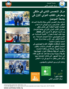 شارك مركز التحسس النائي ممثلا باالاستاذ المساعد الدكتور عبدالرحمن رمزي قبع في ادارة احدى الجلسات العلمية المقامة على هامش ملتقى ومعرض الكتاب الدولي الاول في جامعة الموصل يوم السبت الموافق 1 تشرين الثاني 2025.