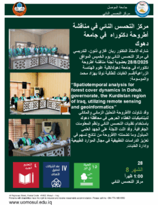 وقد تناولت الأطروحة التحليل الزماني والمكاني لديناميكيات الغطاء الحرجي في محافظة دهوك باستخدام تقنيات التحسس النائي ونظم المعلومات الجغرافية. وقد اثنت اللجنة على الجهد العلمي المبذول وما تضمنته الأطروحة من نتائج تسهم في تعزيز الدراسات التطبيقية في مجال الموارد الطبيعية وإدارة الغابات.