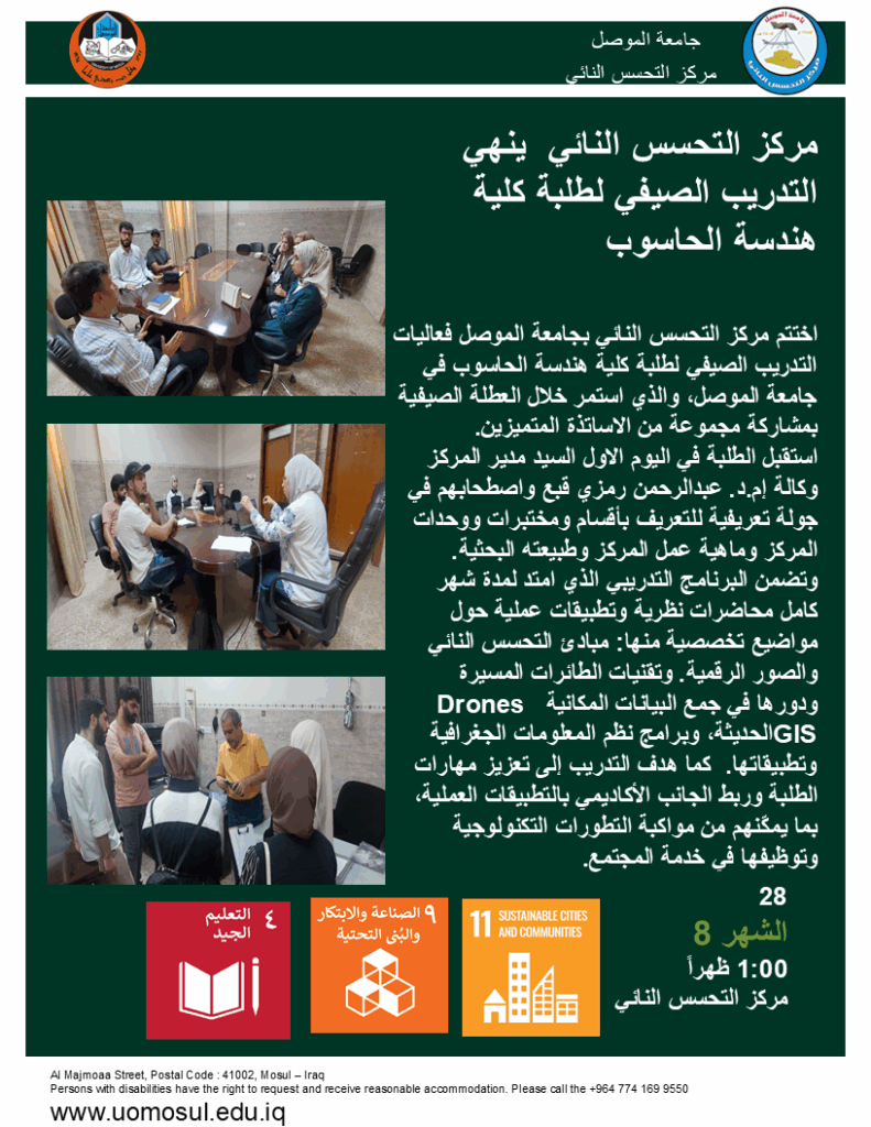 وتأتي هذه المشاركة الى تعزيز التعاون الأكاديمي وتبادل الخبرات بين الجامعات العراقية، ودعم الأبحاث التي تسهم في تحقيق التنمية المستدامة وحماية البيئة.وتأتي هذه المشاركة ضمن نشاطات مركز التحسس النائي العلمية الهادفة إلى تعزيز التعاون الأكاديمي وتبادل الخبرات بين الجامعات العراقية، كما تنسجم مع أهداف التنمية المستدامة، لاسيما الهدف الرابع والهدف السابع عشر والهدف الخامس عشر