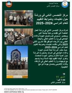 حيث حضر الورشة لجنة ضمان الجودة والاداء الجامعي في المركز وتمحورت الورشة حول أهمية الالتزام بمعايير الجودة المعتمدة، وتعزيز آليات التقييم لهذه السنة وبما ينسجم مع توجهات وزارة التعليم العالي في الارتقاء بالأداء الأكاديمي وضمان جودة البرامج التعليمية.
