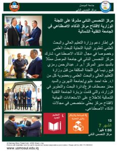 في إطار دعم وزارة التعليم العالي والبحث العلمي لتطوير البنية التحتية للبحث العلمي وخصوصا في مجال الذكاء الاصطناعي، شارك مركز التحسس النائي في جامعة الموصل ممثلا بالسيد مدير المركز أ.م.د. عبدالرحمن رمزي قبع رئيسا في اللجنة المكلفة من قبل وزارة التعليم العالي والبحث العلمي وبعضوية كل من ا.د. طه احمد عليوي/جامعة النهرين والسيد معتز مصطاف فزع/دائرة البحث والتطوير في الوزارة، والتي قامت بزيارة الجامعة التقنية الشمالية للاطلاع على الاستعدادات النهائية لافتتاح مركز بحثي متخصص في مجالات الذكاء الاصطناعي.