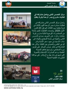 واصل مركز التحسس النائي مشاركته في فعاليات مبادرة جسر الرحمة لليوم الثالث في قرية باطنيا، يوم الثلاثاء الموافق 23 كانون الأول 2025. وتضمنت الفعاليات تقديم سلسلة من المحاضرات التوعوية لطلبة مدارس قرية باطنايا، ركزت على التعريف بمبادئ التحسس النائي وأهميته في خدمة المجتمع والبيئة، إلى جانب الإسهام في جهود محو الأمية ونشر الوعي العلمي والمعرفي بين الطلبة. وتأتي هذه المشاركة في إطار حرص المركز على تعزيز دوره المجتمعي، وترسيخ مفاهيم المعرفة العلمية، ودعم المبادرات الإنسانية والتنموية التي تسهم في بناء جيل واعٍ وقادر على مواكبة التطورات العلمية الحديثة.