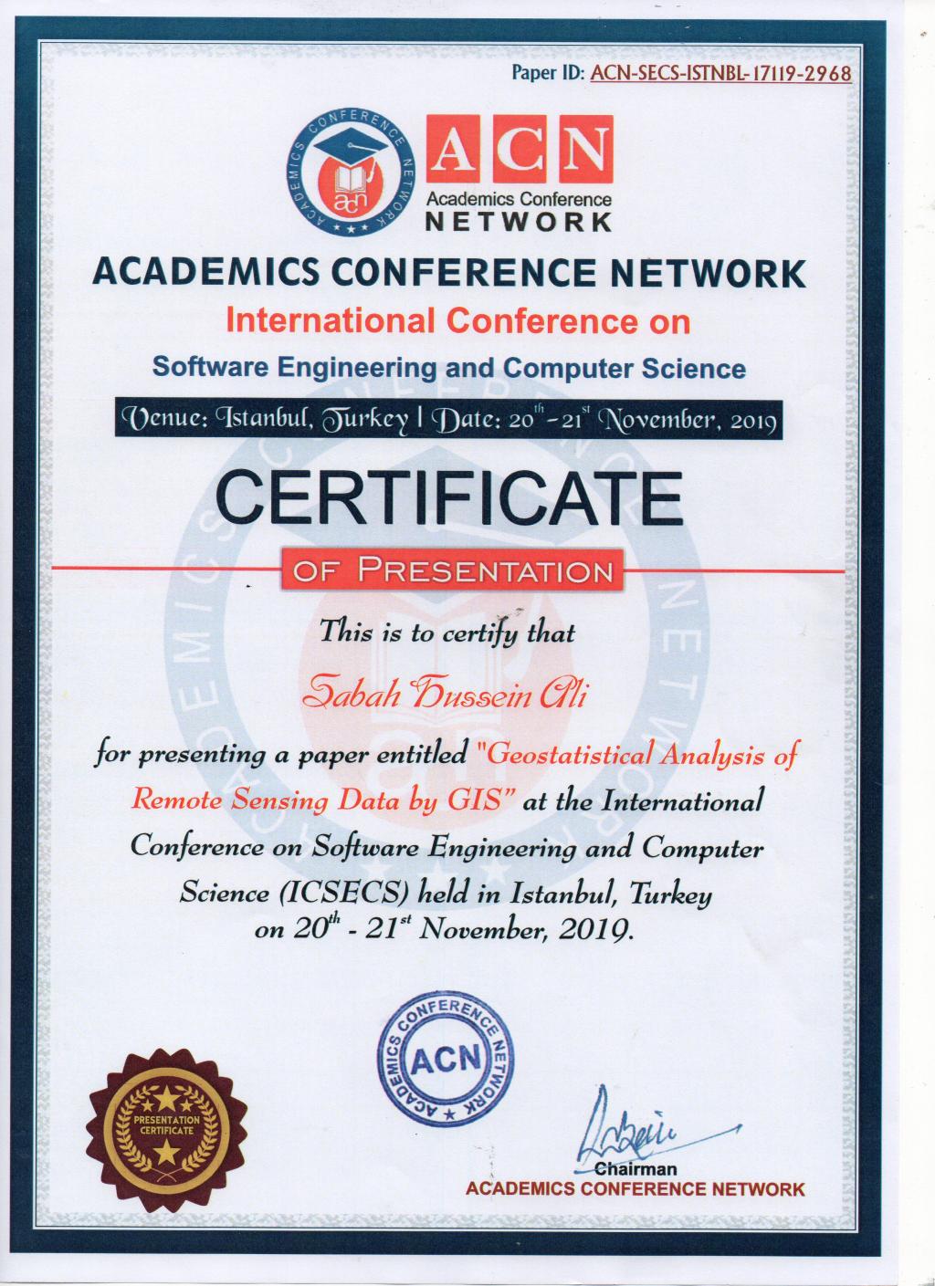 شارك كل من الدكتور فاتن عزيز والأستاذ المساعد صباح حسين علي رئيس قسم المعالجة الرقمية في مركزنا في المؤتمر العالمي في هندسة البرمجيات وعلوم الكومبيوتر الذي عقد في تركيا / اسطنبول للفترة 20-21 تشرين الثاني 2019، حيث تمت المشاركة بإلقاء البحث الموسوم :”Geostatistical Analysis of Remote Sensing Data by GIS”