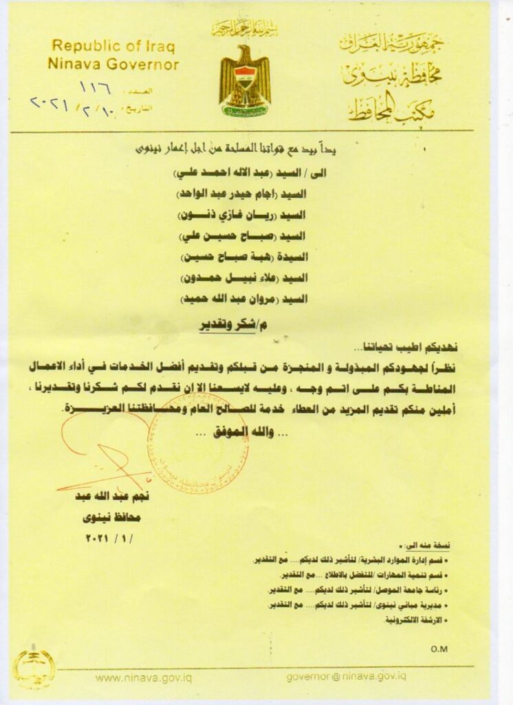 شكر وتقدير من السيد محافظ نينوى الى كادر مركز التحسس النائي في جامعة الموصل