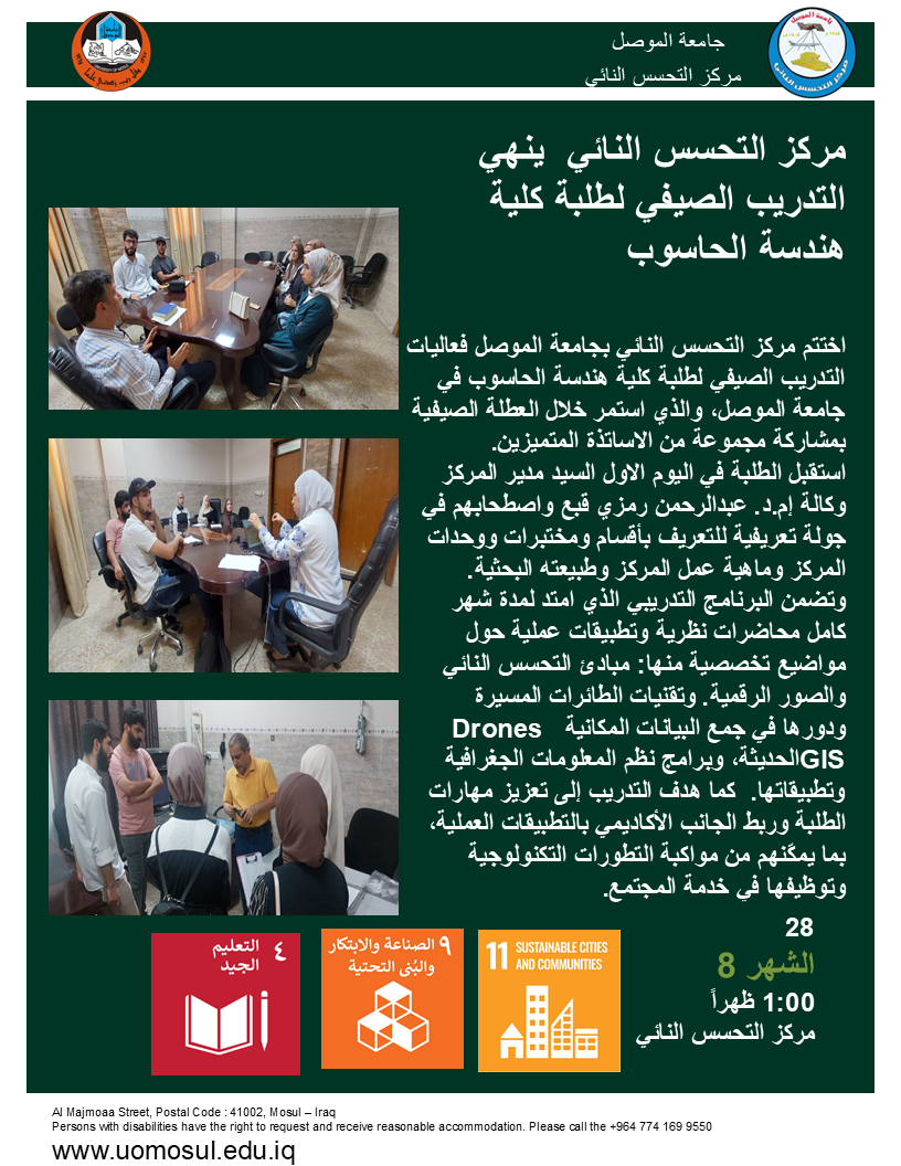 hibaabd2025-08-30T12:40:43+03:00اختتم مركز التحسس النائي بجامعة الموصل فعاليات التدريب الصيفي لطلبة كلية هندسة الحاسوب في جامعة الموصل، والذي استمر خلال العطلة الصيفية بمشاركة مجموعة من الاساتذة المتميزين. استقبل الطلبة في اليوم الاول السيد مدير المركز وكالة ا.م.د. عبدالرحمن رمزي قبع واصطحبهم في جولة تعريفية للتعريف باقسام ومختبرات ووحدات المركز وماهية عمل المركز وطبيعته البحثية. وتضمن البرنامج التدريبي الذي امتد لمدة شهر كامل محاضرات نظرية وتطبيقات عملية حول مواضيع تخصصية منها: مبادئ التحسس النائي والصور الرقمية. وتقنيات الطائرات المسيرة Drones ودورها في جمع البيانات المكانية الحديثة، وبرامج نظم المعلومات الجغرافية GIS وتطبيقاتها. كما هدف التدريب إلى تعزيز مهارات الطلبة وربط الجانب الأكاديمي بالتطبيقات [إقرأ المزيد]