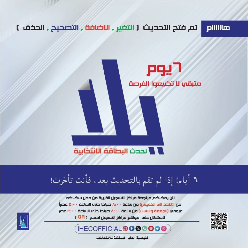 سيحضر غداً الاثنين الموافق 19/5 كادر من المفوضية العليا للانتخابات الى مبنى كلية الحقوق / المجمع الثاني ، من اجل تحديث البطاقة الانتخابية ، وحسب التوجيهات يستلزم جلب المستمسكات الاربعة من اجل التحديث ، وسيكون تواجد الكادر في قاعة الدكتورة ليلى .