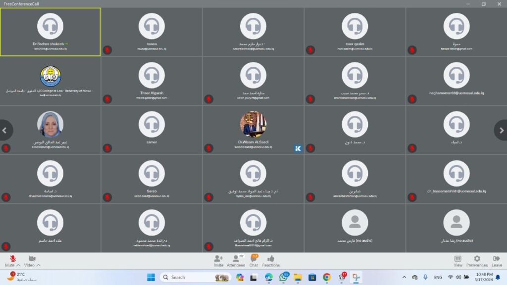 بإشراف وحضور الاستاذ المساعد الدكتور وسام نعمت ابراهيم السعدي عميد كلية الحقوق بجامعة الموصل والسادة رئيس واعضاء اللجنة الامتحانية المركزية واللجان الفرعية وتدريسيي الكلية المعنيين بالامتحان اعلاه والفريق التقني ونظرا لإختيار كليتنا مركزا امتحانيا تقويميا لعموم كليات القانون في جامعات محافظة نينوى ، فقد أقامت كليتنا يوم الجمعة الموافق ١٧ أيار ٢٠٢٤ ورشة تدريبية الكترونية عبر تطبيق free confrence ناقشت التعليمات الوزارية المتعلقة بالامتحان التقويمي ومهام وواجبات المراقب الأقدم للقاعة الامتحانية الخاصة بالامتحان اعلاه كذلك توجيهات رئاسة جامعة الموصل وتعليماتها الكفيلة بإنسيابية الامتحان ودقته وشفافيته كذلك التعليمات المتعلقة بالطالب وآلية الاجابة والتسليم ، ومن الجدير بالذكر فإن كليتنا قد أنهت كافة الاستعدادات والمتطلبات المتعلقة بالامتحان اعلاه وفقا لما هو محدد من وزارة التعليم العالي والبحث العلمي ورئاسة جامعة الموصل .