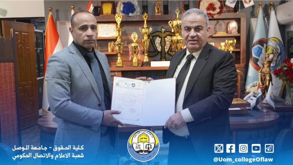 ناقش فرع القانون العام في كلية الحقوق بجامعة الموصل يوم الاثنين الموافق ٢٣ حزيران ٢٠٢٥ اطروحة دكتوراه عن الافتراض في البنيان المعنوي للجريمة ، حضر جانبا منها الاستاذ الدكتور عبدالعزيز رمضان علي عميد الكلية وعددا من اعضاء مجلس الكلية وتدريسييها .