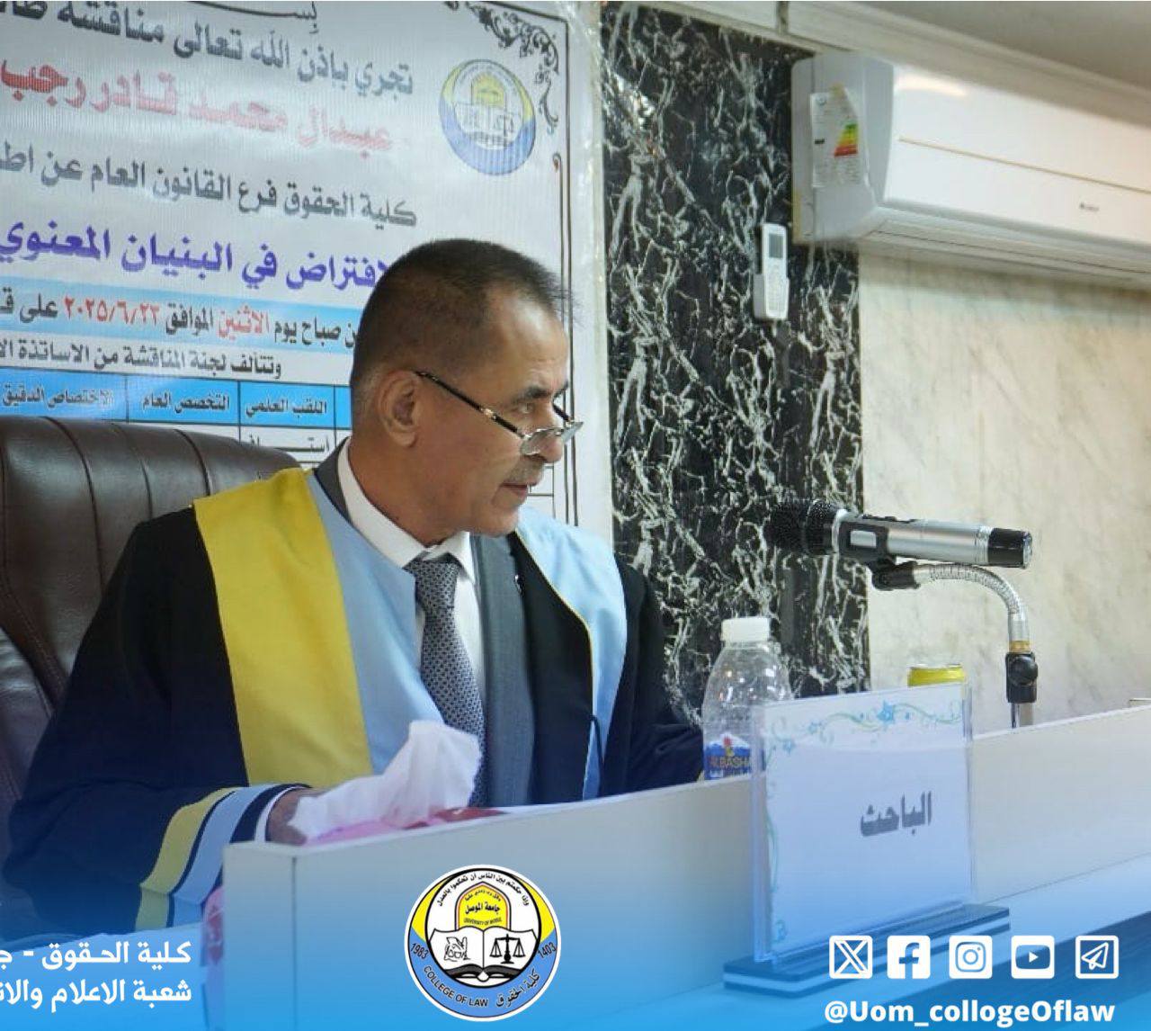 ناقش فرع القانون العام في كلية الحقوق بجامعة الموصل يوم الاثنين الموافق ٢٣ حزيران ٢٠٢٥ اطروحة دكتوراه عن الافتراض في البنيان المعنوي للجريمة ، حضر جانبا منها الاستاذ الدكتور عبدالعزيز رمضان علي عميد الكلية وعددا من اعضاء مجلس الكلية وتدريسييها .