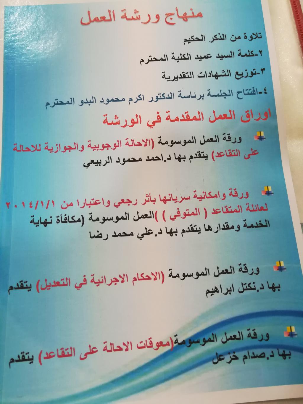 اعلان عن ورشة عمل (قانون التعديل الاول لقانون التقاعد الموحد رقم 9 لسنة 2014 المرقم 26 لسنة 2019 بين الواقع والطموح)
