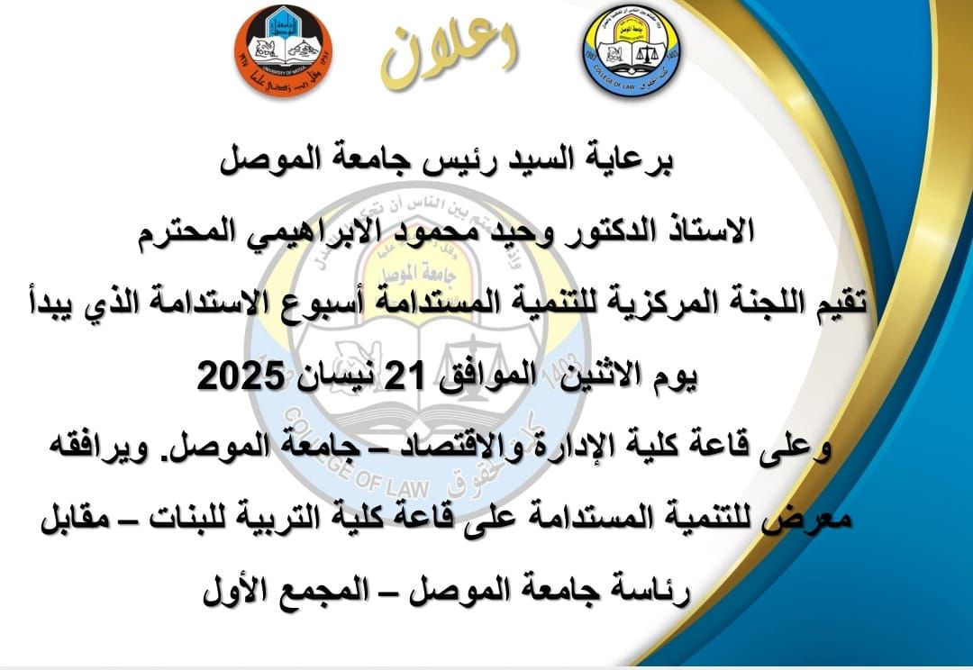 برعاية الاستاذ الدكتور وحيد محمود الابراهيمي رئيس جامعة الموصل ، ستقيم اللجنة المركزية للتنمية المستدامة وعلى قاعة كلية الإدارة والاقتصاد في الحادية عشر من صباح يوم الاثنين الموافق ٢١ نيسان ٢٠٢٥ اسبوع التنمية المستدامة ، كما سيقام على قاعة كلية التربية للبنات / مقابل رئاسة جامعة الموصل في المجمع الاول معرضا للتنمية المستدامة .