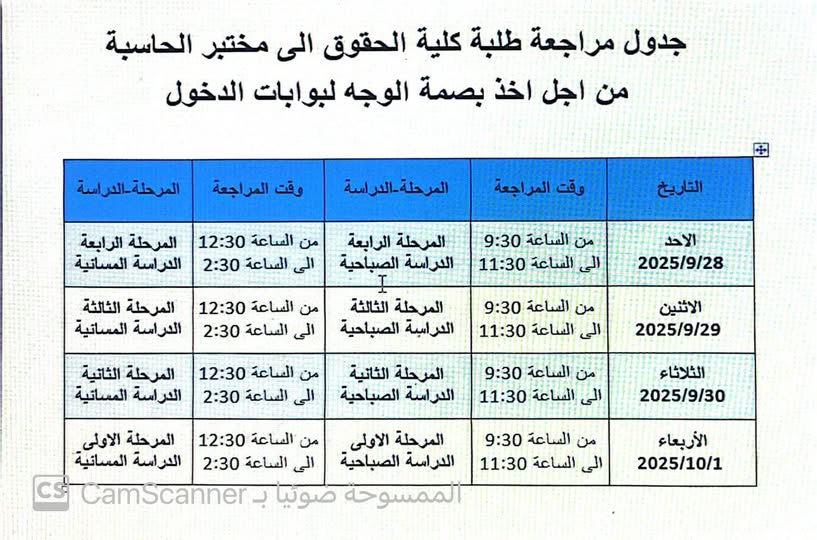نعلن لكن جدول بتوقيات مراجعتكم الى مختبر الحاسوب لغرض اخذ بصمة البوابات الالكترونية