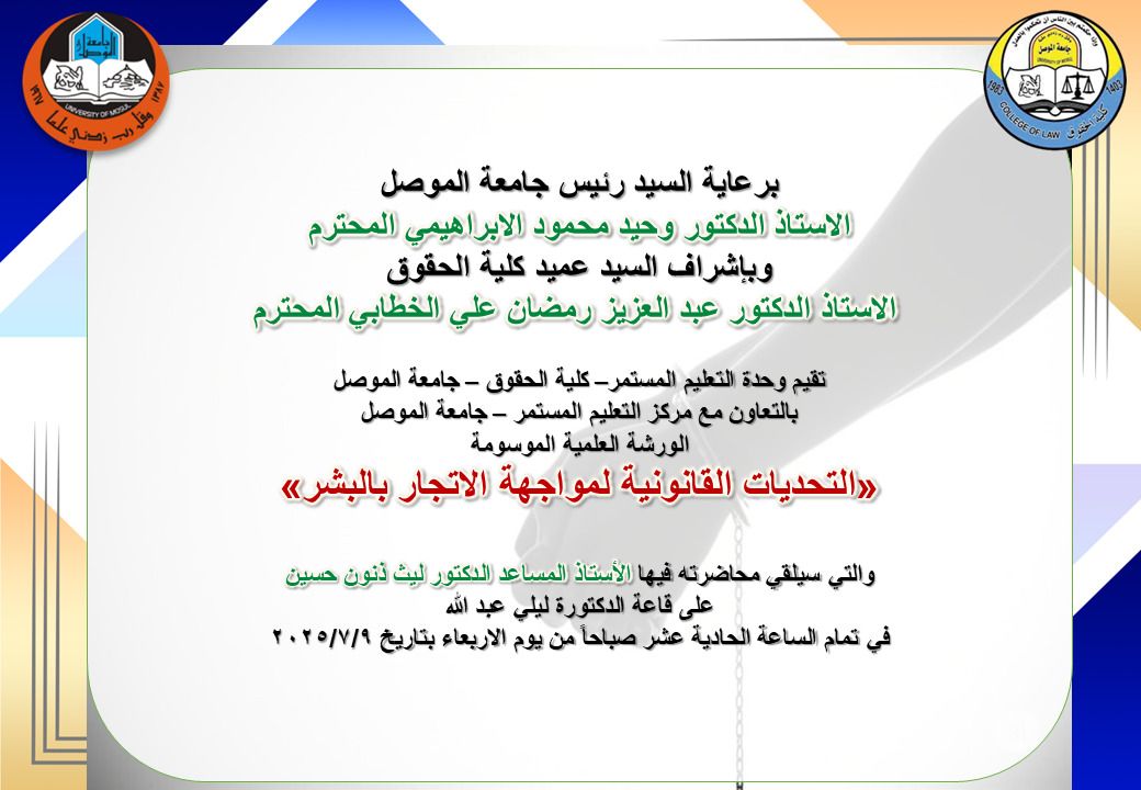 ورشة علمية عن التحديات القانونية لمواجهة الاتجار بالبشر،،، برعاية الاستاذ الدكتور وحيد محمود الابراهيمي رئيس جامعة الموصل وبإشراف الاستاذ الدكتور عبدالعزيز رمضان علي عميد كلية [إقرأ المزيد]