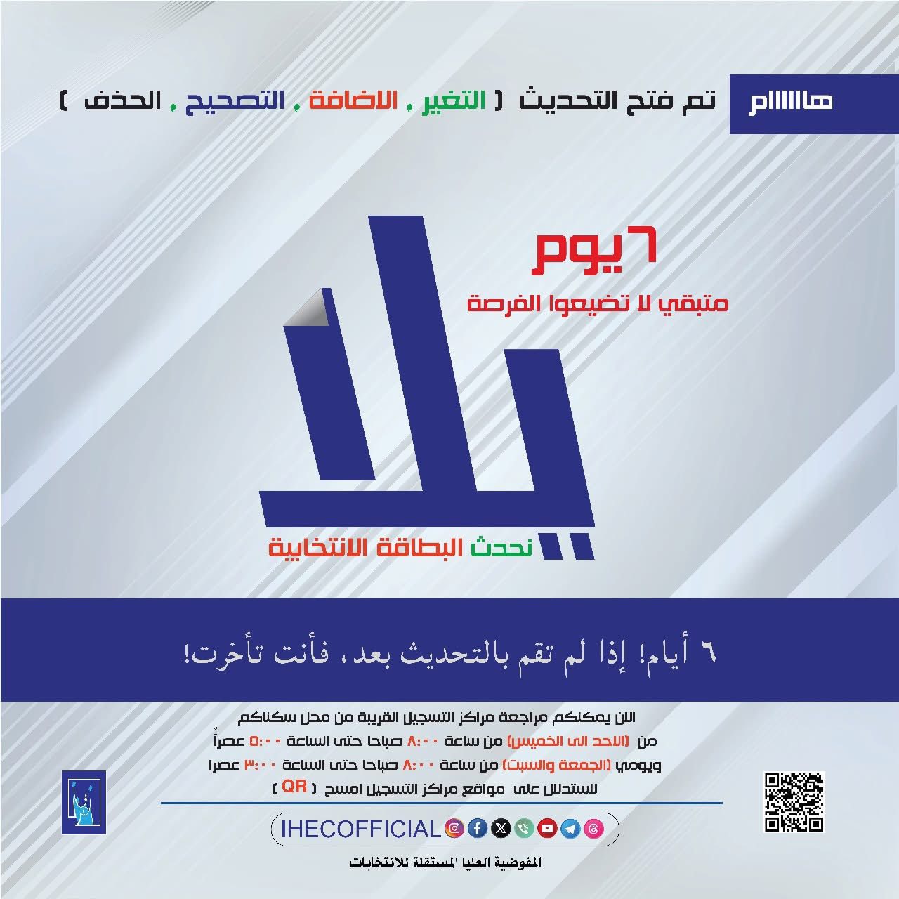 طلبتنا الاعزاء سيحضر غداً الاثنين الموافق 19/5 كادر من المفوضية العليا للانتخابات الى مبنى كلية الحقوق / المجمع الثاني ، من اجل تحديث البطاقة الانتخابية [إقرأ المزيد]
