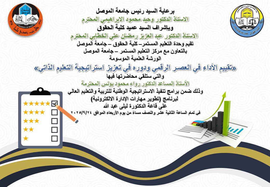 أقامت وحدة التعليم المستمر في الكلية وبالتعاون مع مركز التعليم المستمر – جامعة الموصل ،يوم الأربعاءالموافق24/9/2025 ورشة علمية موسومة: “تقييم الأداء في العصر الرقمي ودوره [إقرأ المزيد]