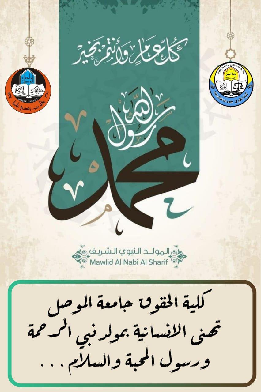 تهنئ عمادة كلية الحقوق بمجلسها وكادرها العلمي والاداري الامة الاسلامية جمعاء بمولد خير الانام النبي محمد صلى الله عليه وسلم