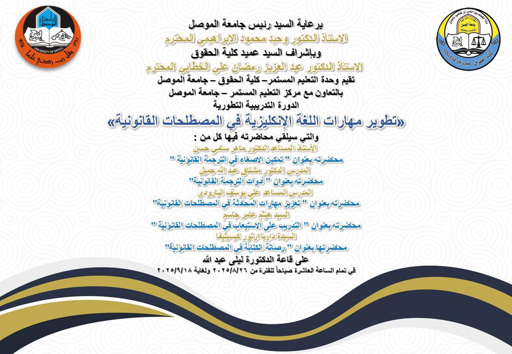 انطلاق دورة تطوير مهارات اللغة الإنكليزية في المصطلحات القانونية بكلية الحقوق – جامعة الموصل برعاية السيد رئيس جامعة الموصل الأستاذ الدكتور وحيد محمود إلابراهيمي ، [إقرأ المزيد]