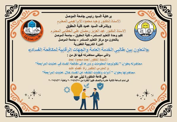 كلية الحقوق في جامعة الموصل تختتم اليوم الثلاثاء الموافق 26 آب 2025 الدورة التدريبية عن مكافحة الفساد ضمن إطار التعاون بين كلية الحقوق/ جامعة الموصل [إقرأ المزيد]