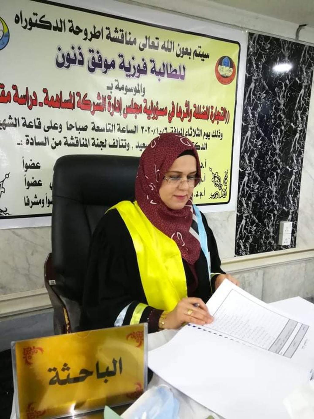 بحضور الدكتور وسام نعمت ابراهيم السعدي المحترم عميد الكلية جرت في كليتنا يوم الثلاثاء الموافق 2020/10/6 مناقشة طالبة الدكتوراه في فرع القانون الخاص فوزية موفق ذنون عن اطروحتها الموسومة (التجارة المضللة واثرها في مسؤولية مجلس ادارة الشركةالمساهمة )باشراف الدكتور اجياد ثامر نايف رئيس فرع القانون الخاص ، وقد توصلت الباحثة الى عدد من النتائج كان في مقدمتها ان التجارة المضللة تعد احدى التصرفات غير المشروعة التي يقوم بها مجلس ادارة الشركة المساهمة خلال ادارته للشركة وتؤدي هذه التجارة الى نهوض مسؤوليته القانونية عن هذه التجارةولم ينظم التشريع العراقي والتشريعات المقارنة مفهوم التجارة المضللة بنصوص صريحة واضحة ولم يرد فيها تعريف لهذا المصطلح ، وفي ختام المناقشة قبلت اللجنة اطروحة الطالبة وتم منحها شهادة الدكتوراه في القانون الخاص