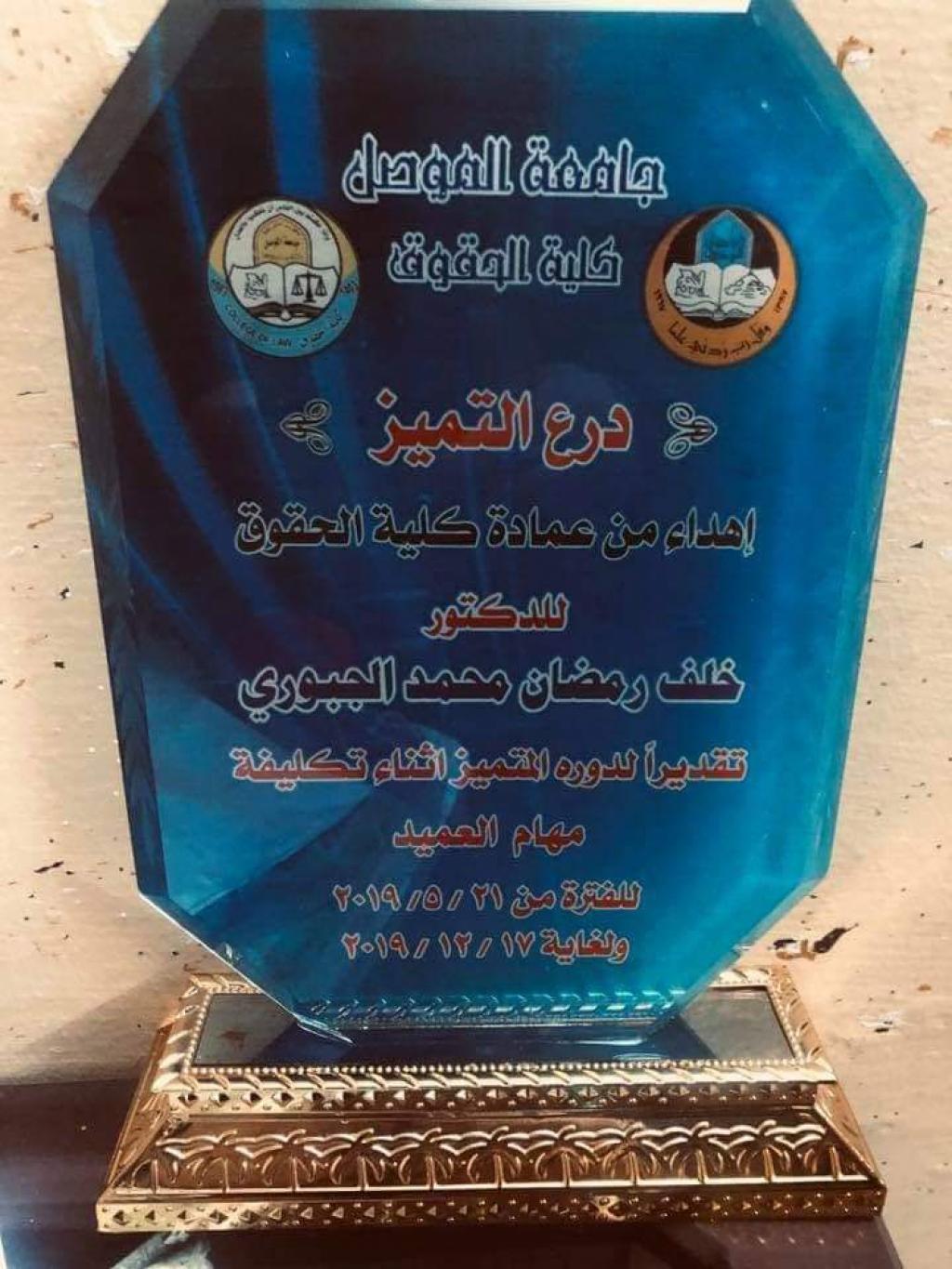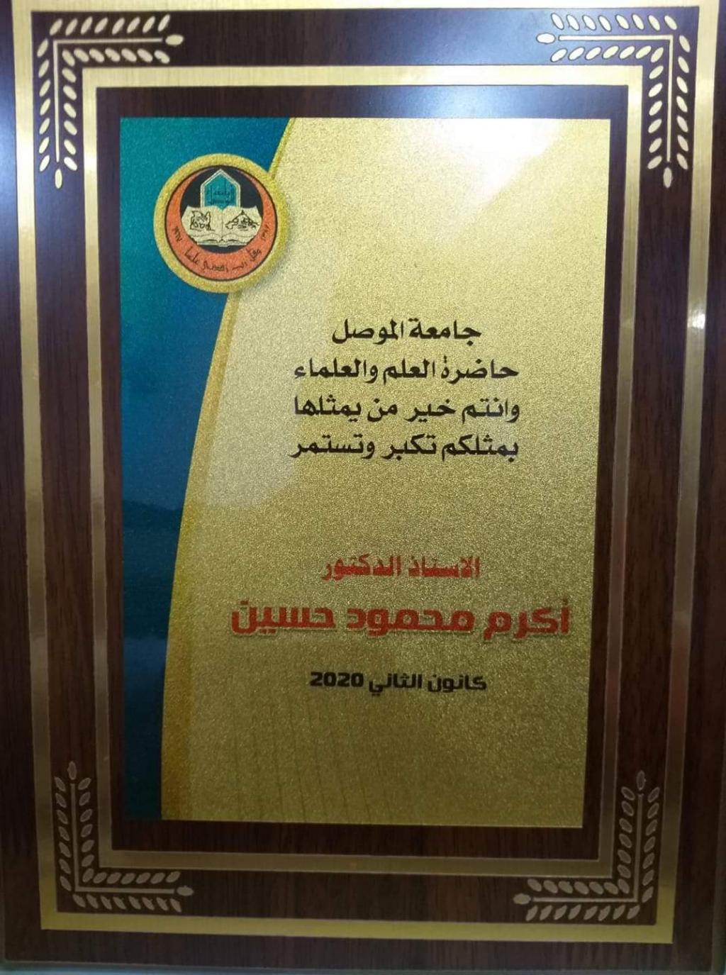 كرم الدكتور ( قصي كمال الدين الاحمدي ) على قاعة المنتدى العلمي يوم الثلاثاء الموافق 21/1/2020 الاستاذ الدكتور ( أكرم محمود حسين ) المحترم بدرع التميز والابداع وذلك عن جهوده المتميزة اثناء فترة عمله مساعدا لرئيس الجامعة للشؤون الادارية والمالية كما تم تكريم الاستاذ المساعد الدكتور (خلف رمضان محمد ) المحترم بدرع التميز والابداع ايضا وذلك عن جهوده المتميزة في فترة عمله عميدا لكليتنا وقد حضر التكريم الدكتور ( عمار سعدون حامد) المحترم عميد كليتنا والسادة اعضاء مجلس الجامعة ، ويعبر هذا التكريم عن الكفاءة والتميز والجدية في العمل التي يحظى بها منتسبو كليتنا .