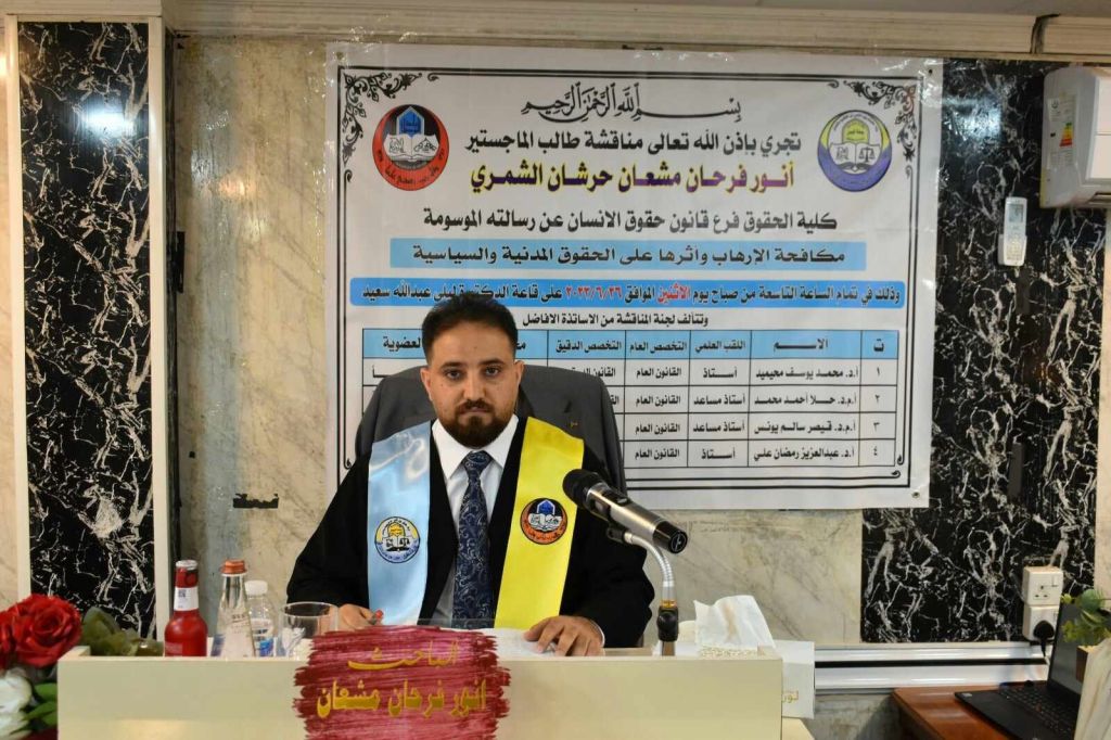 نظرا للجهود المتميزة المبذولة من قبل الدكتور محمد يوسف محيميد/ كلية الحقوق بجامعة تكريت في دعم الانشطة العلمية والثقافية والطلابية في كليتنا ومشاركته في مناقشة طالب الماجستير في فرع قانون حقوق الانسان انور فرحان مشعان ، فقد تم تكريمه بشهادة تقديرية من قبل الاستاذ المساعد الدكتور وسام نعمت ابراهيم السعدي عميد الكلية ، وبدورها تهنئ عمادة الكلية والسادة اعضاء مجلس الكلية وكادريها العلمي والاداري وطلبتها الدكتور محمد يوسف محيميد متمنين له المزيد من العطاء العملي والابداع الاكاديمي خدمة لمسيرة العلم والمعرفة في كليتنا العزيزة جامعتنا العريقة وعراقنا الآبي .