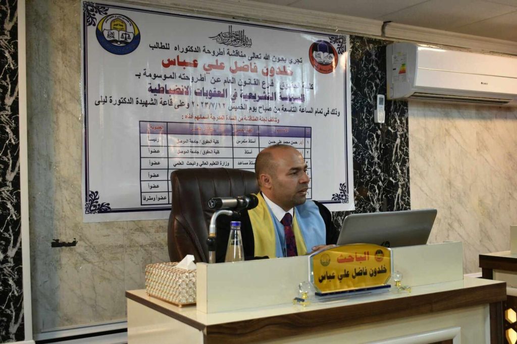 نظرا للجهود المتميزة المبذولة من قبل الدكتور سرمد رياض عبدالهادي/ وزارة التعليم العالي والبحث العلمي في دعم الانشطة العلمية والثقافية والطلابية في كليتنا ومشاركته في مناقشة طالب الدكتوراه في فرع القانون العام خلدون فاضل علي ، فقد تم تكريمه بشهادة تقديرية سلمه إياها نيابة عن عمادة الكلية الدكتور خلف رمضان محمد معاون العميد للشؤون الإدارية والمالية ، وبدورها تهنئ عمادة الكلية والسادة اعضاء مجلس الكلية وكادريها العلمي والاداري وطلبتها الدكتور سرمد رياض عبدالهادي متمنين له المزيد من العطاء العملي والابداع الاكاديمي خدمة لمسيرة العلم والمعرفة في كليتنا العزيزة جامعتنا العريقة وعراقنا الآبي .