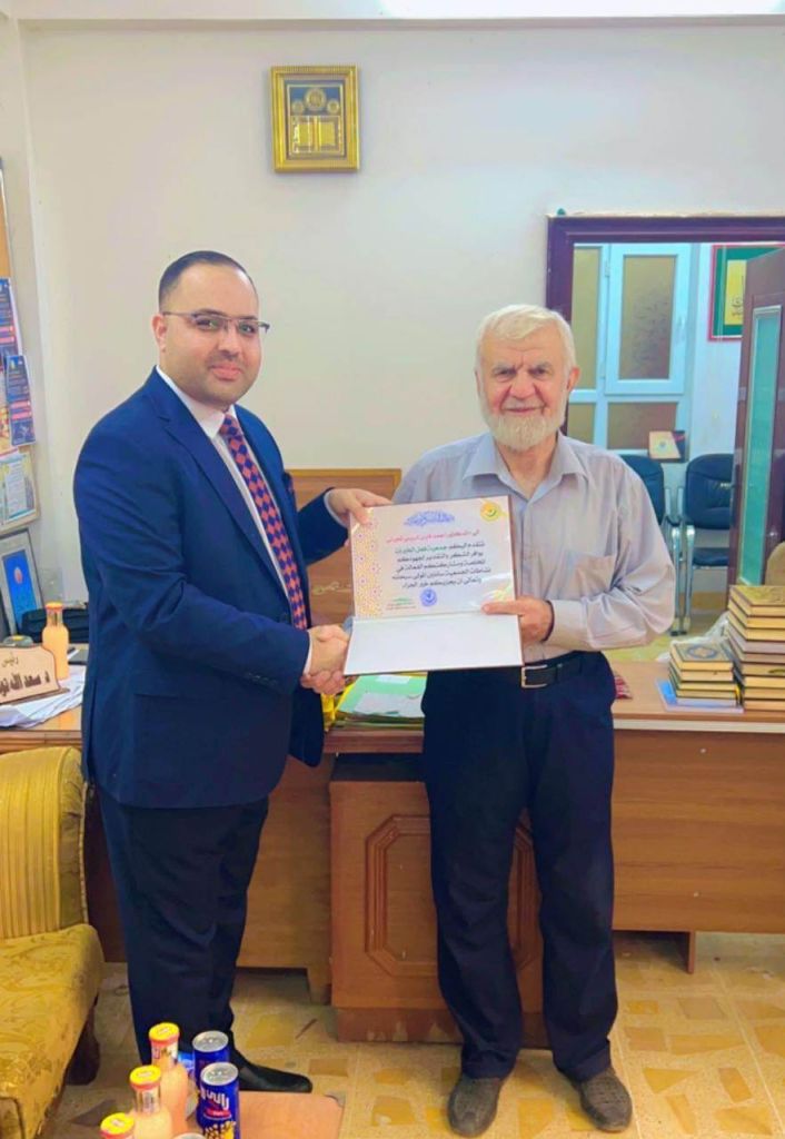 نظرا للجهود المتميزة المبذولة من قبل الدكتور خالد عوني خطاب/ مدير الاحوال المدنية والجوازات والاقامة في نينوى في دعم الانشطة العلمية والثقافية والطلابية في كليتنا ومشاركته في مناقشة طالب الماجستير في فرع القانون العام علي عبدالمجيد عبدالحميد ، فقد تم تكريمه بشهادة تقديرية من قبل الاستاذ المساعد الدكتور وسام نعمت ابراهيم السعدي عميد الكلية ، وبدورها تهنئ عمادة الكلية والسادة اعضاء مجلس الكلية وكادريها العلمي والاداري وطلبتها الدكتور خالد عوني خطاب متمنين له المزيد من العطاء العملي والابداع الاكاديمي خدمة لمسيرة العلم والمعرفة في كليتنا العزيزة جامعتنا العريقة وعراقنا الآبي .